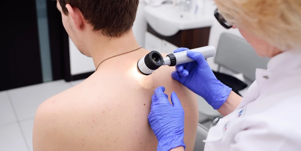 A skin check technician carries out routine visual assessments and symptom reviews.